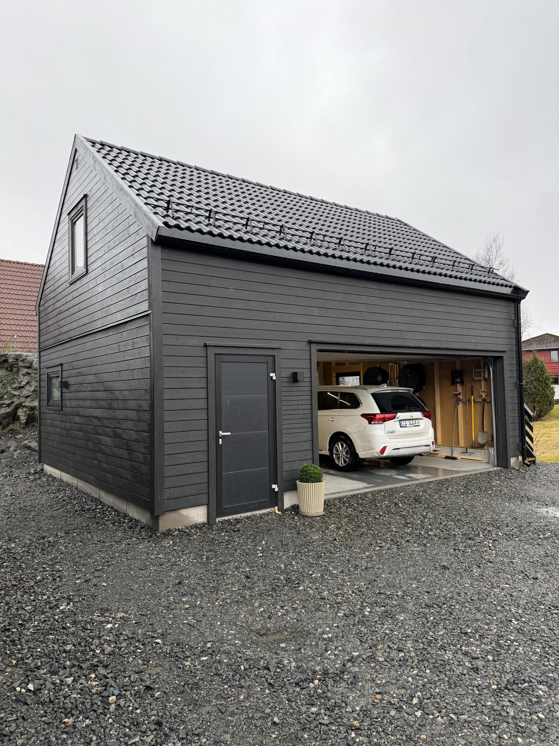 Mathias ønsket en garasje som skulle være mest mulig lik huset. Med det sikter han til lik takvinkel, uten kister, med brytningspanel og sorte detaljer. Garasjen ser derfor ut som en «miniversjon» av huset som stod der fra før.