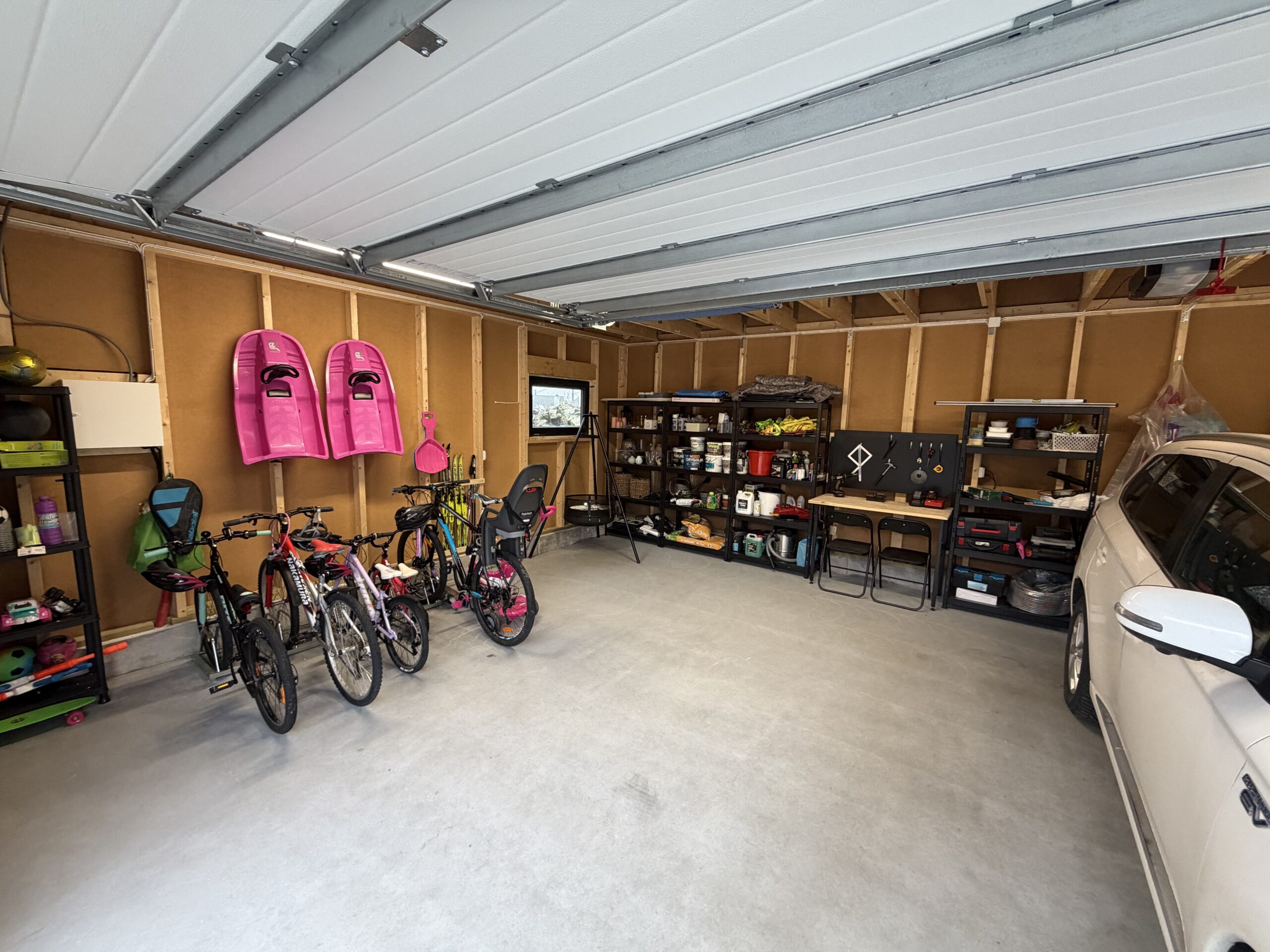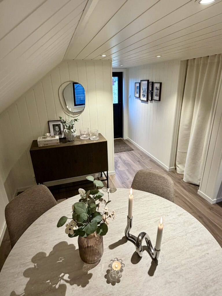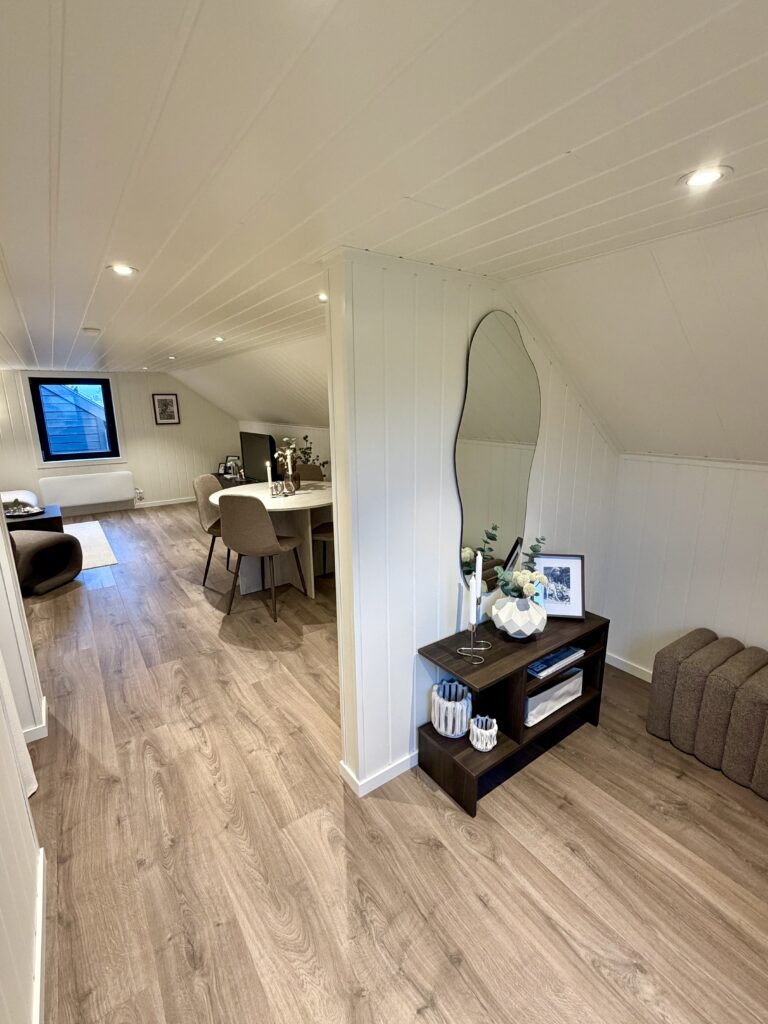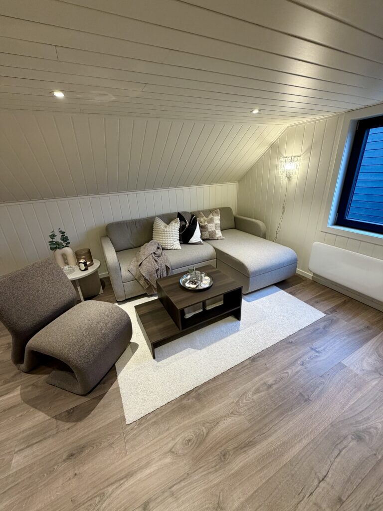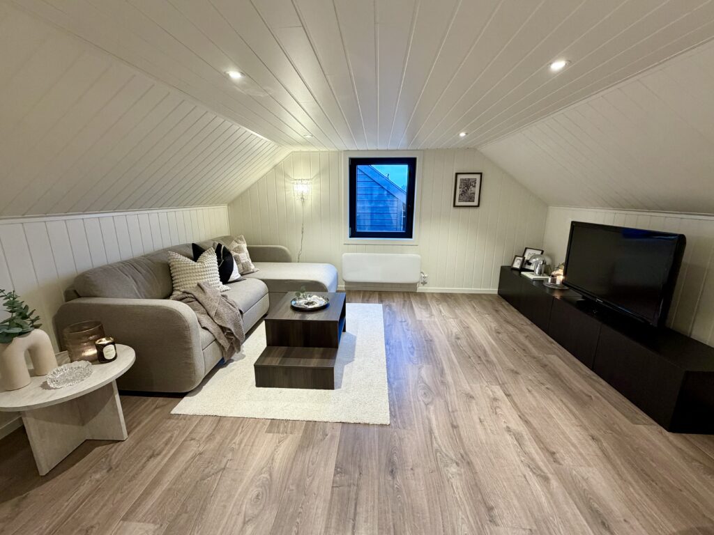 Garasjen er langt mer enn bare en parkeringsplass for to biler. Mathias har valgt å utnytte potensialet i bygget maksimalt ved å innrede loftsetasjen som et lunt og trivelig oppholdsrom. Selv om bodareal var viktig, valgte de en åpen løsning i første etasje uten lettvegger for å bevare den romslige følelsen.