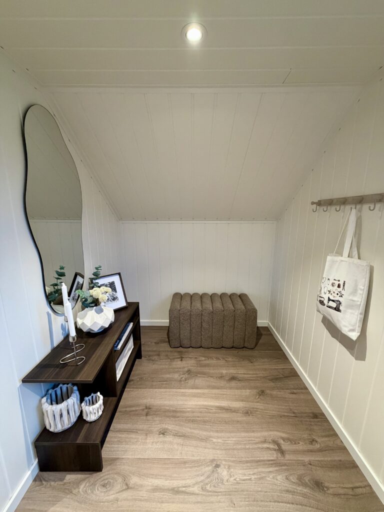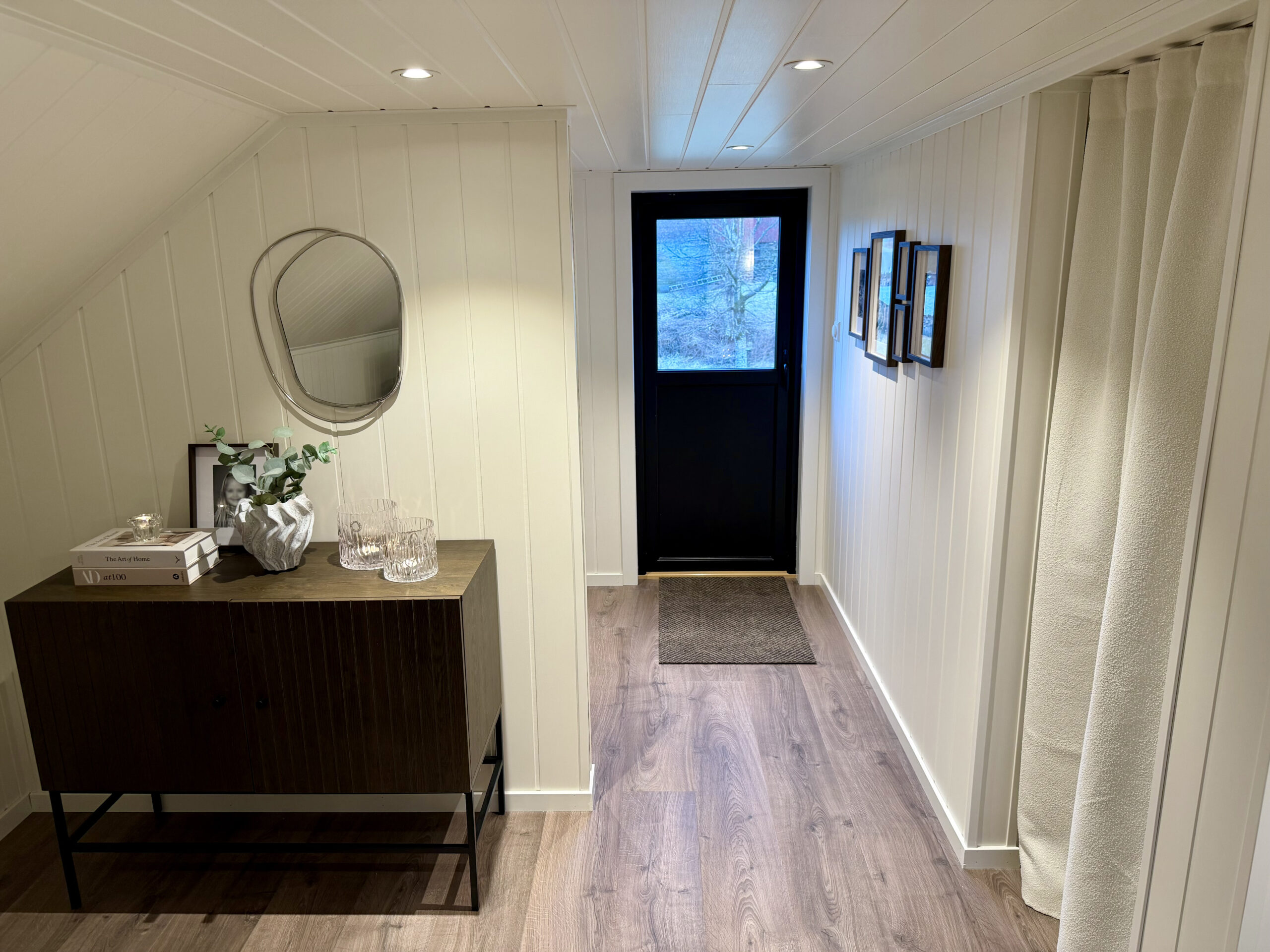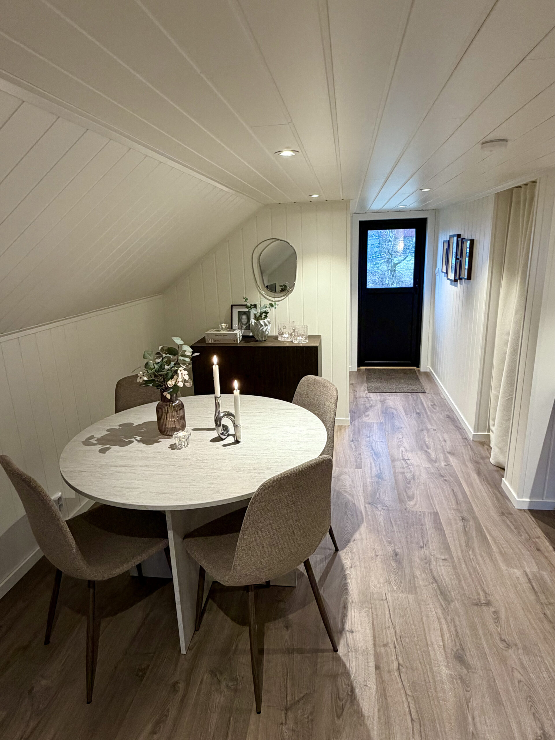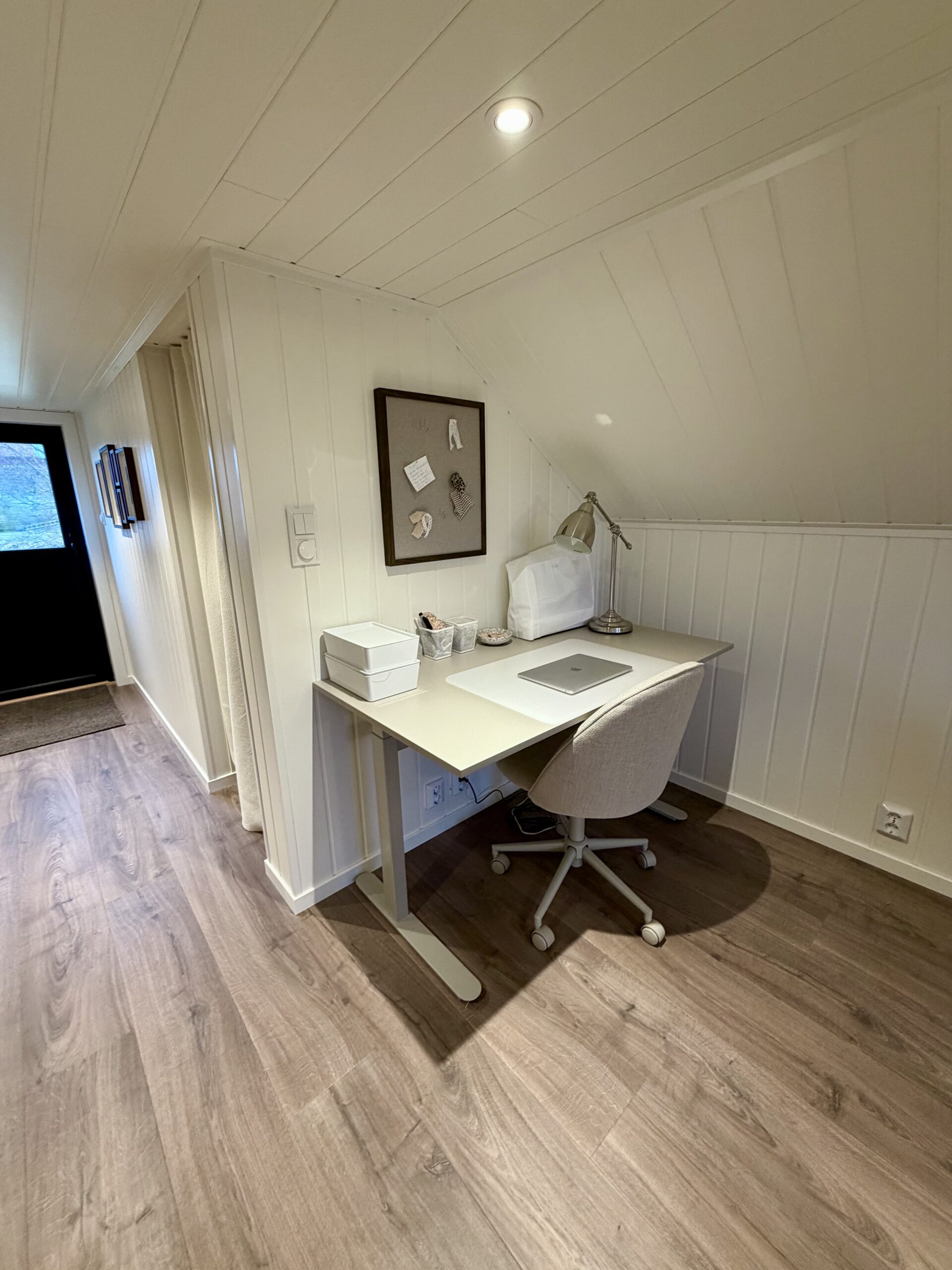 Garasjen er langt mer enn bare en parkeringsplass for to biler. Mathias har valgt å utnytte potensialet i bygget maksimalt ved å innrede loftsetasjen som et lunt og trivelig oppholdsrom. Selv om bodareal var viktig, valgte de en åpen løsning i første etasje uten lettvegger for å bevare den romslige følelsen.