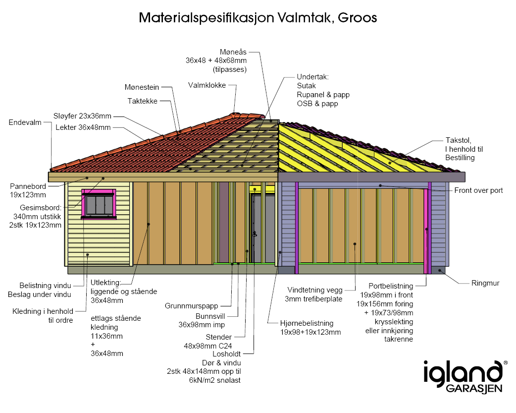 Groos kjennetegnes av sitt særegne utseende med en helvalmet takkonstruksjon. På et valmtak skråner alle fire sidene på taket jevnt nedover. Vanligvis leverer vi denne modellen med en takvinkel på 22 grader, men vi kan også levere med andre takvinkler mellom 15 til 29 grader.