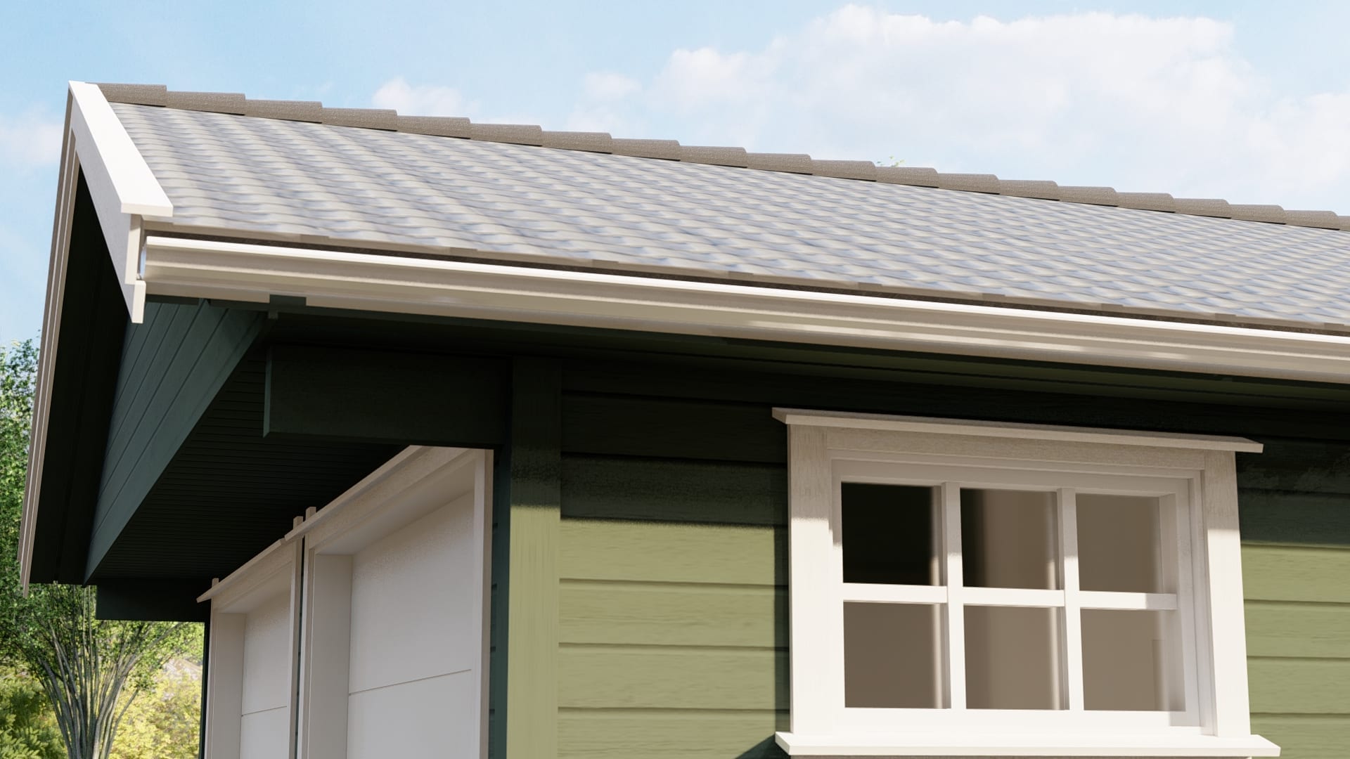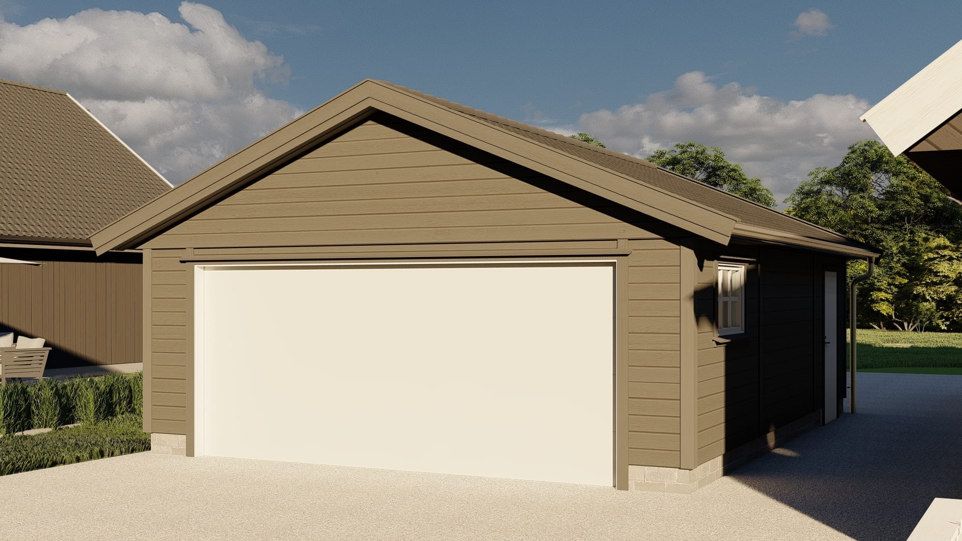 Fremskutt front velges dersom man har lignende løsning på huset. Da vil du få «takoverheng» over porten med innkjøring på gavlsiden. Fremskutt front kan leveres i ulike varianter – på drager, med søyler eller på vegg. Vi gjør oppmerksom på at fremskutt front vil telle som en del av totalarealet på garasjen. Fremskutt front på drager er den eneste løsningen hvor det ikke en del av totalarealet.